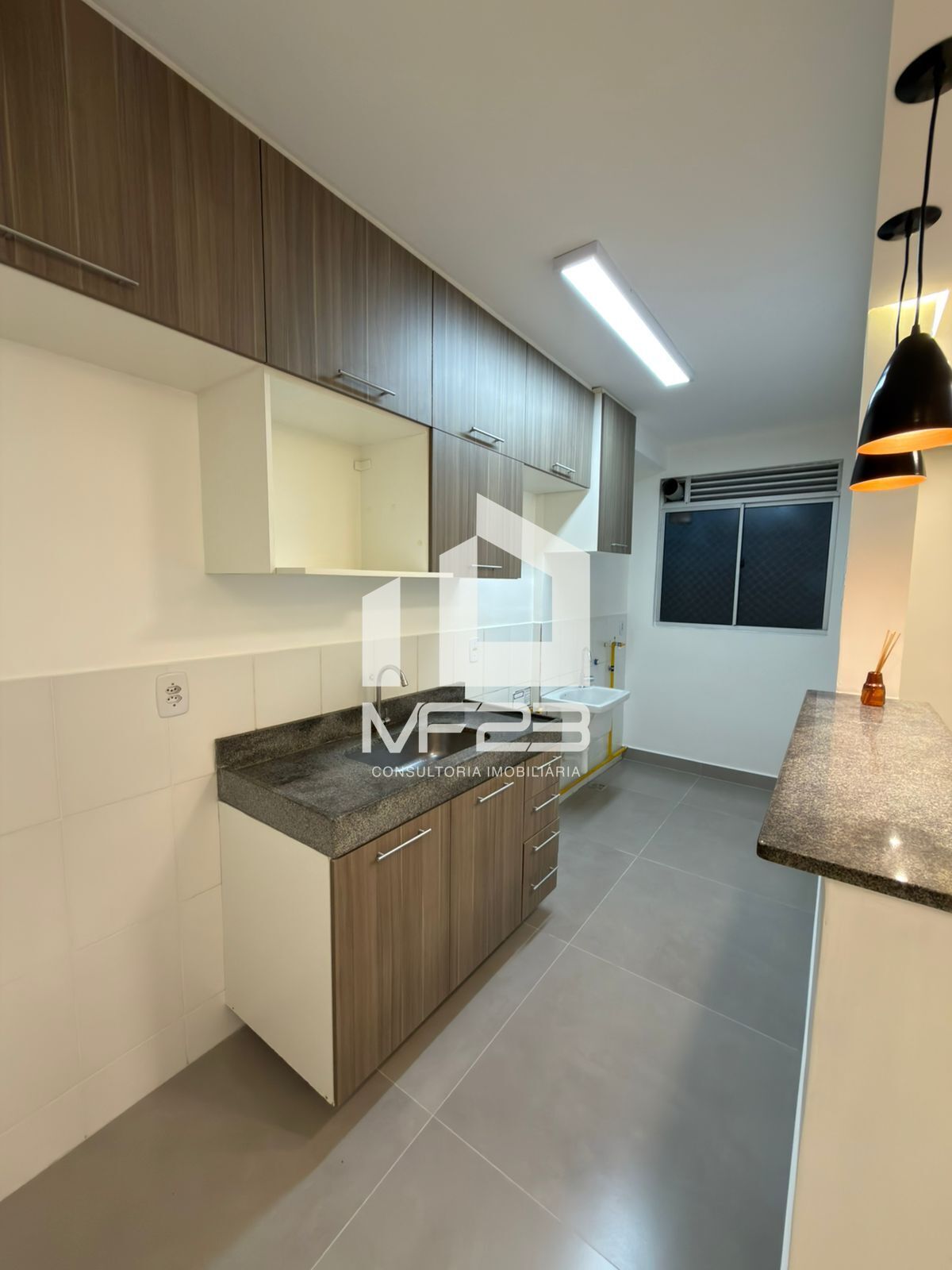 O apartamento é composto por 02 quartos, sendo 01 suíte, armário nos quartos, cozinha e banheiro.